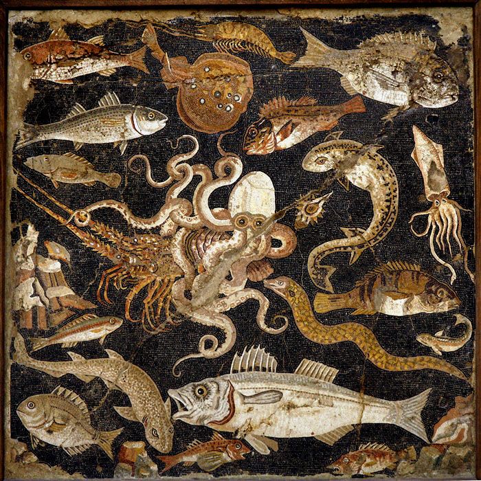 La testa di pesci arcimboldiana è sempre mi-ti-ca! La prima immagine ( quella col polpo nel mezzo) di dov’è? È qualche affresco romano tipo quelli di Pompei?