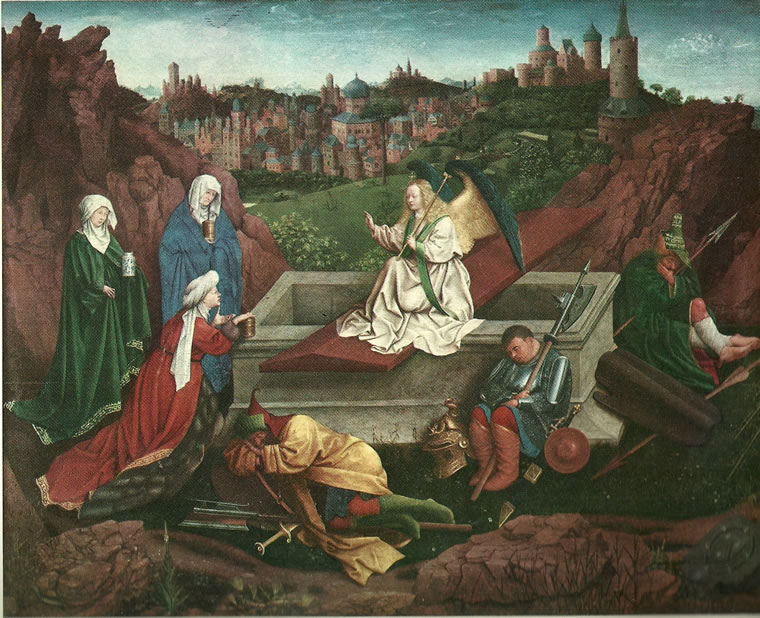Quest’opera di Van Eyck risulta molto più realistica delle precedenti, sia per dettagli sia per l’uso di colori, simili alla realtà. L’oro viene abbandonato per lasciare spazio a un mix di colori che sia armonizzano tra loro. Come di consueto, il tocco di bianco puro è dato alla veste dell’angelo sopra il sepolcro, mentre per le tre Marie, l’artista ha optato per 3 colori differenti ma complementari. Inoltre, in accordo alla sua tendenza fiamminga, Van Eyck introduce all’interno dell’opera minuziosi dettagli, dalle armi dei soldati, alla straordinaria rappresentazione della città nello sfondo, uno degli elementi più particolari della scena.