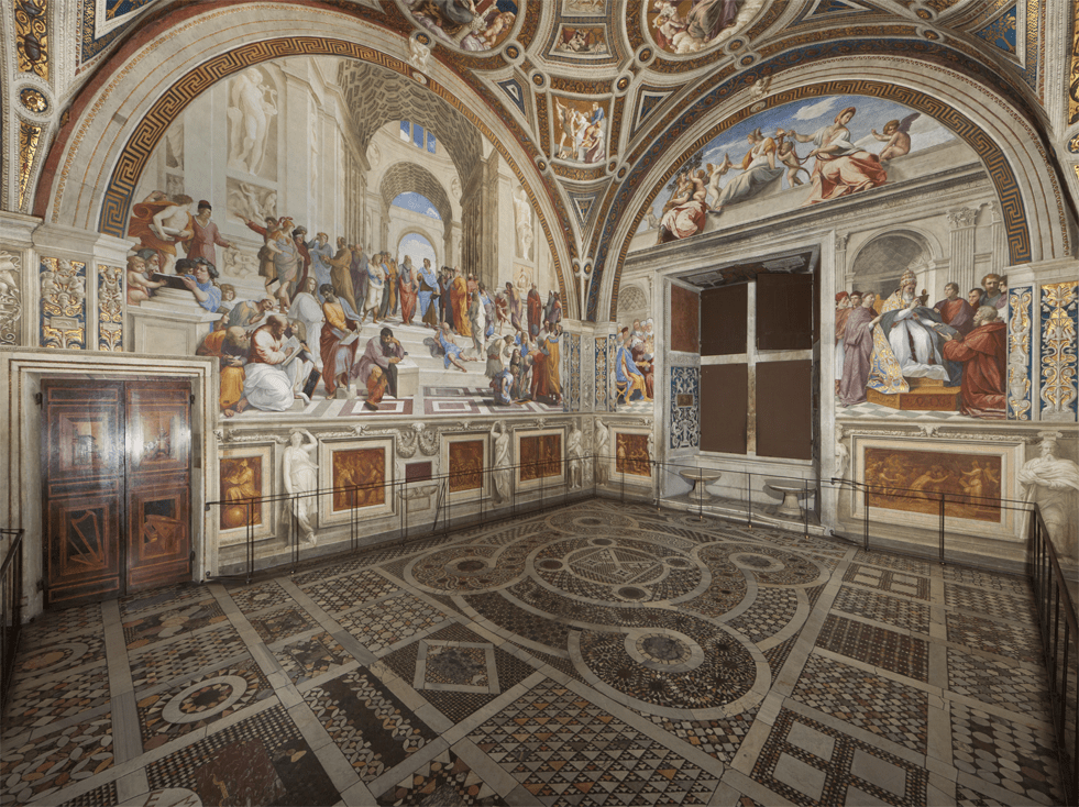 Le Stanze decorate da Raffaello sono quattro conosciute come Stanza della Segnatura, Stanza di Eliodoro, Stanza dell’Incendio di Borgo, Stanza di Costantino. La Stanza della Segnatura fu la prima ad essere affrescata, adibita a studio e biblioteca del Papa. Raffaello per la decorazione di pareti, volta e zoccolatura si avvalse di alcuni aiuti di altri artisti per completare i lavori.