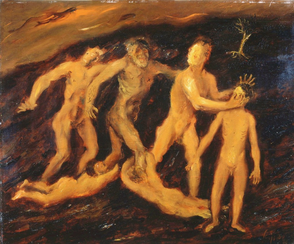 Ci sono uomini nudi, dipinti come alieni sulla terra arsa e senza vita, spazzata da un vento sterile. L’orizzonte è segnato da pochi alberi, dai tronchi secchi, alzati quasi a sostenere il cielo cupo che si eleva oltre la fine del quadro. Dolore, pena, si mescolano a speranza e timore, a indugio e accettazione. E forse i raggi incandescenti appartengono al Verbo che illumina e prepara, rafforza e purifica.