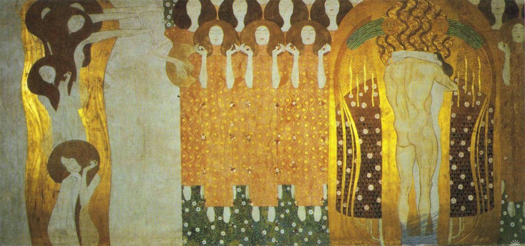 Diviso in tre parti, il fregio inizia nella parete sinistra con Il Desiderio di felicità, prosegue in quella centrale con L’umanità che soffre e le forze ostili e finisce a destra, con l’Inno alla gioia. Il fregio racconta il percorso che il Cavaliere dovrà compiere per raggiungere la donna, sconfiggendo le forze del male e resistendo alle tentazioni di sirene malvagie. E’ un percorso che l’umanità deve intraprendere per raggiungere il proprio compimento nella felicità.