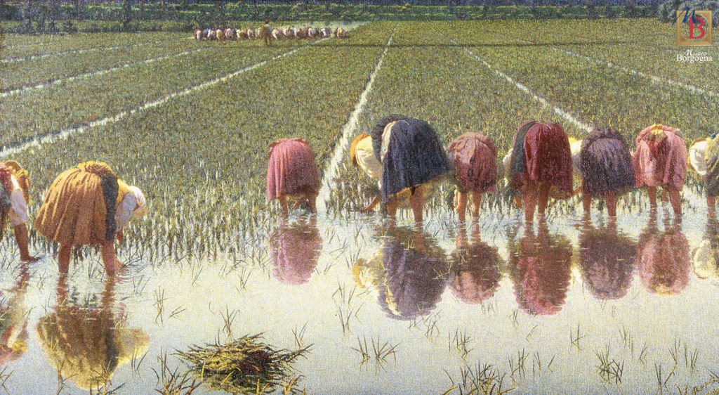 Nel 1893 Morbelli dipinge questo quadro, in cui denuncia il lavoro delle mondine. Il paesaggio è diviso da numerosi canali, usati per inondare le coltivazioni di riso, mentre in primo piano vi sono figure riprese di schiena. Sono chinate in avanti e affondano le loro mani dentro la terra fangosa. La loro immagine si riflette nello specchio d’acqua in primo piano.