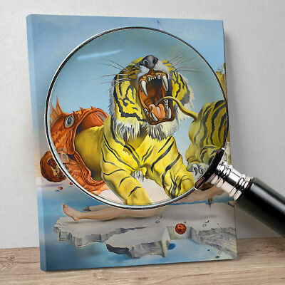 Il corpo nudo di una donna distesa, levita su di uno scoglio perfettamente liscio, sospeso sopra un mare piatto e vetrificato. La donna sembra dormire serenamente mentre due tigri la stanno per aggredire. In realtà tutta la scena è, tipicamente, surreale. All’estrema sinistra del dipinto, da una grande melagrana spaccata esce un pesce con la bocca spalancata. Dalla bocca dell’animale fuoriesce una grande tigre, e dalle fauci spalancate di quest’ultima esce fuori un’altra tigre più piccola. L’azione prosegue con un fucile a baionetta che sta per toccare il braccio della donna distesa. La scena riserva altre visioni surreali.