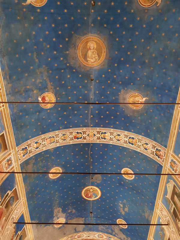 Considerata uno dei massimi capolavori dell’arte occidentale, la Cappella degli Scrovegni venne decorata con affreschi da Giotto, ormai quarantenne e all’apice della sua fama. Scelse di ricoprire l’intera superficie muraria della Cappella con un vasto e articolato ciclo di affreschi, un vero e proprio progetto iconografico e decorativo unitario, ispirato da un teologo agostiniano Alberto da Padova. La particolarità di questi affreschi è data dagli sfondi, realizzati con l’azzurrite applicata a secco, rendendo il colore più intenso.