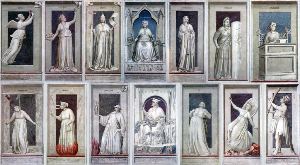 Le pareti della navata presentano nella parte più bassa, un alto zoccolo di finti marmi realizzati in modo realistico, dai quali si aprono alcune nicchie con le 14 allegorie dei Vizi e delle Virtù dipinte in monocromo. Esse rappresentano il percorso del settimo giorno, e simboleggiano il viaggio verso la Beatitudine, anche in rapporto agli affreschi soprastanti. Sono quindi due percorsi terapeutici e di salvezza, che Giotto riprende dalla teologia Agostiniana.