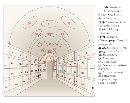 Anche le architetture di sfondo sono chiare e reali, proporzionate con le figure che interagiscono con esse. Per esempio nella Presentazione della Vergine al Tempio vi sono tante forme combinate che creano un gioco di vuoti e pieni, anche date dall’alternarsi di luci ed ombre. Anche la Cacciata dei mercanti dal Tempio presenta un’articolata costruzione tridimensionale. Un altro raggiungimento tecnico di questi affreschi è la rappresentazione dell’aureola in scorcio prospettico nelle figure di profilo, in sintonia con la prospettiva dello spazio.