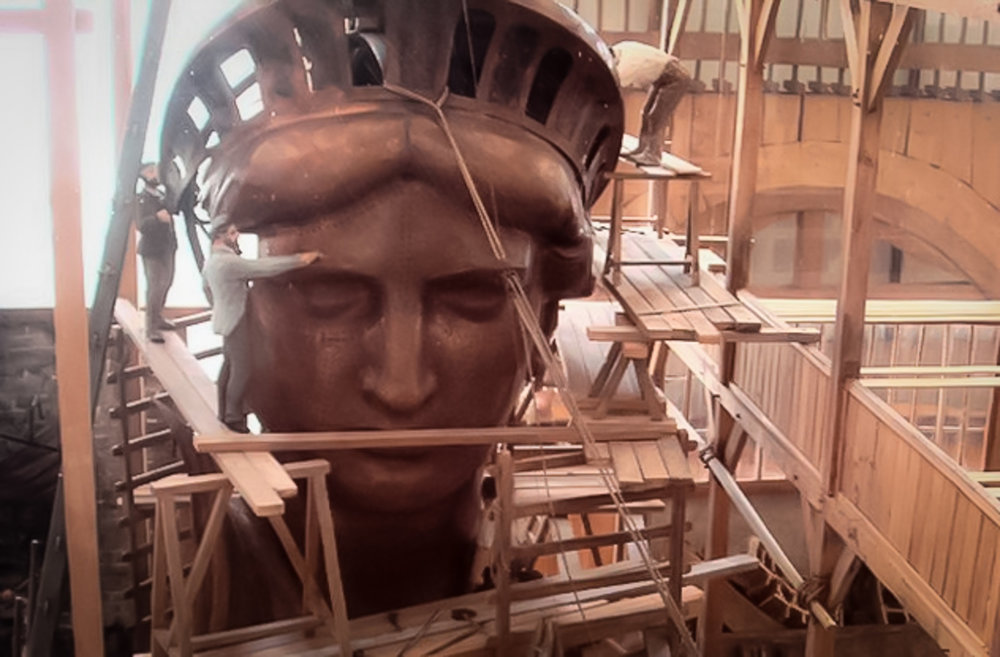 Data la forma complessa, ogni singola sella dovette essere forgiata singolarmente con un minuzioso lavoro artigianale, così anche l’assemblaggio della statua doveva avvenire in maniera particolare. Bartholdi infatti pensò di far costruire la struttura e il rivestimento della statua in un apposito cantiere in Francia, poi smontarla per il trasporto negli Stati Uniti, e assemblarla nuovamente nel luogo definitivo su Liberty Island. La statua fu portata dai francesi agli Stati Uniti attraverso moltissime casse su una piccola nave che dovette effettuare numerosi viaggi, e successivamente assemblata, in segno di amicizia tra i due popoli.