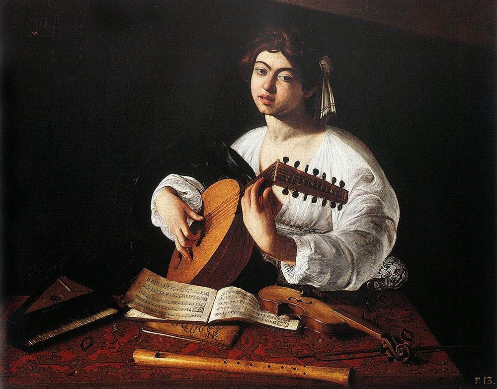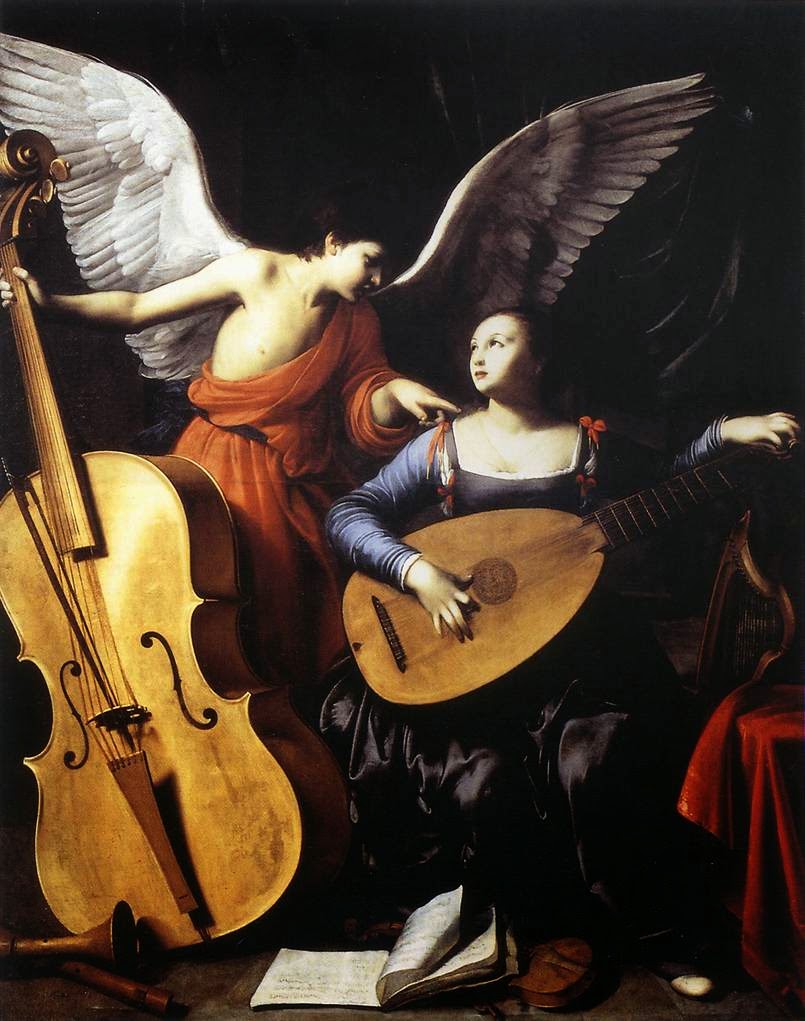 Due secoli più tardi, anche Caravaggio darà al tema della musica e della religione una versione originale. Lo possiamo vedere nell’opera Riposo durante la fuga in Egitto dove l’angelo, figura celestiale e divina, scende in terra per suonare con il violino una musica dallo spartito tenuto in mano da Giuseppe. Tema molto amato dall’artista fin dai primissimi dipinti, tra cui la versione del Suonatore di liuto. Anche Carlo Saraceni, amico di Caravaggio riproduce nella sua Santa Cecilia con l’Angelo, strumenti musicali, come il grande violone sorretto dall’angelo ed il liuto suonato dalla santa. Questo per sottolineare che proprio Santa Cecilia, fu protettrice della musica, degli strumentisti e dei cantanti.