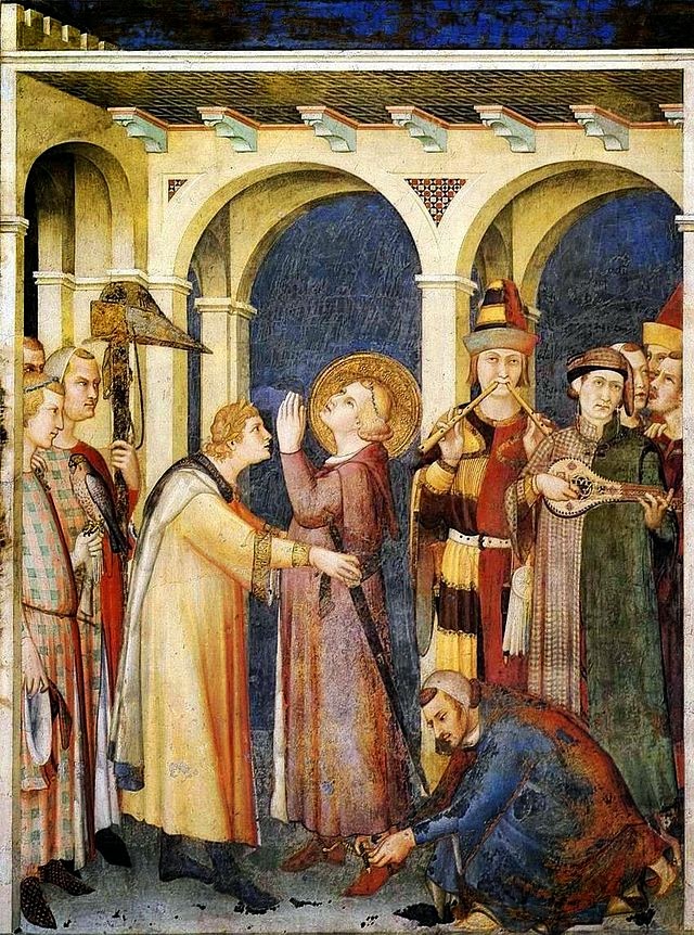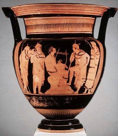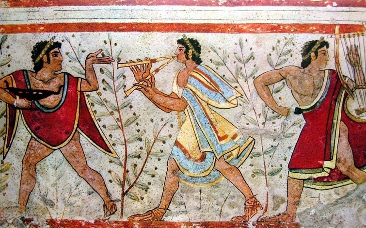 Già in età etrusca il concetto di musica ebbe una mutazione, legandosi agli aspetti ludici del buon vivere. Ad esempio negli affreschi della Necropoli di Tarquinia, sono raffigurati suonatori di flauti e di lire circondati da danzatori, con lo scopo di intrattenere. Interessante fu la figura dell’ “aulos” un doppio flauto che per millenni fu utilizzato prima nelle domus di patrizi ed imperatori, poi nelle regge di principi, marchesi e conti, fino ad arrivare nelle corti medievali. Testimonianze medievali di questo strumento le troviamo nell’affresco dell’Investitura di San Martino, opera di Simone Martini del 1318, ma anche nei codici miniati medievali, come quello del XIV secolo secolo, del poeta Remède de Fortune.