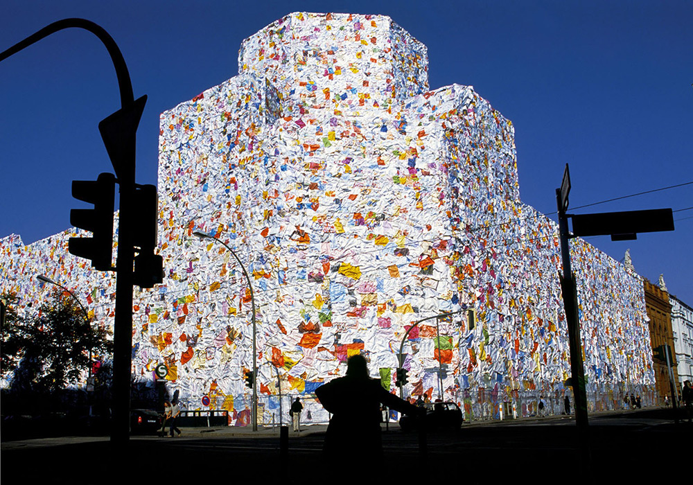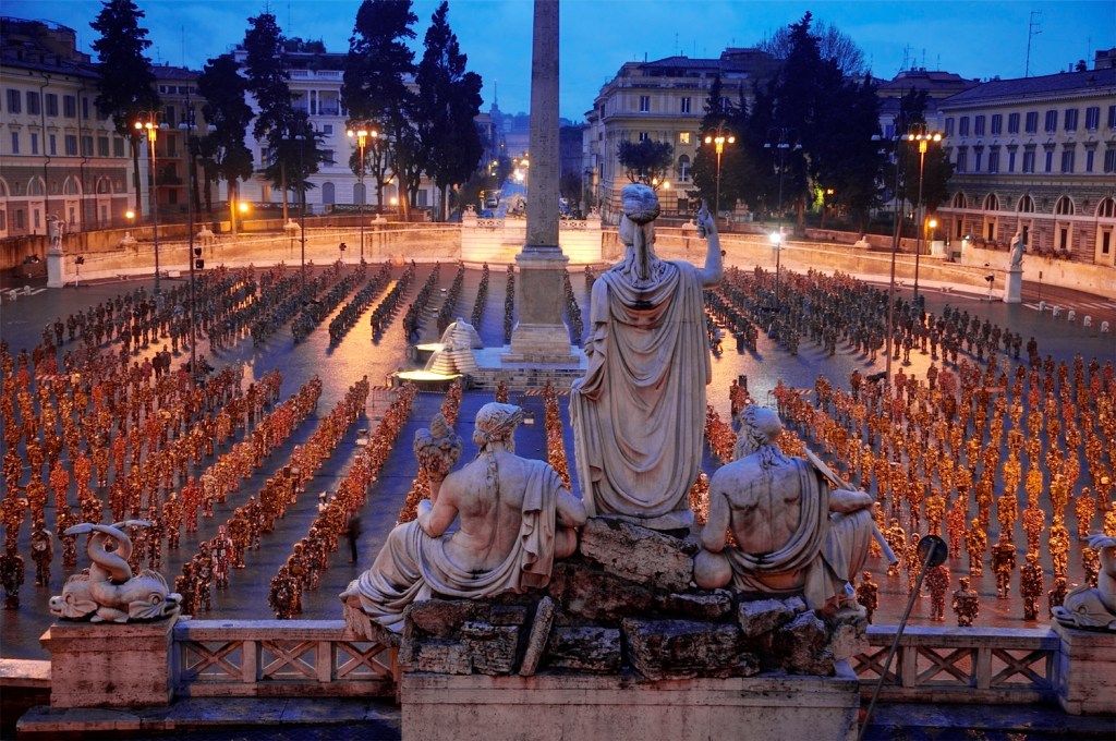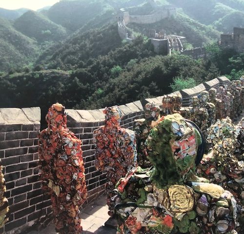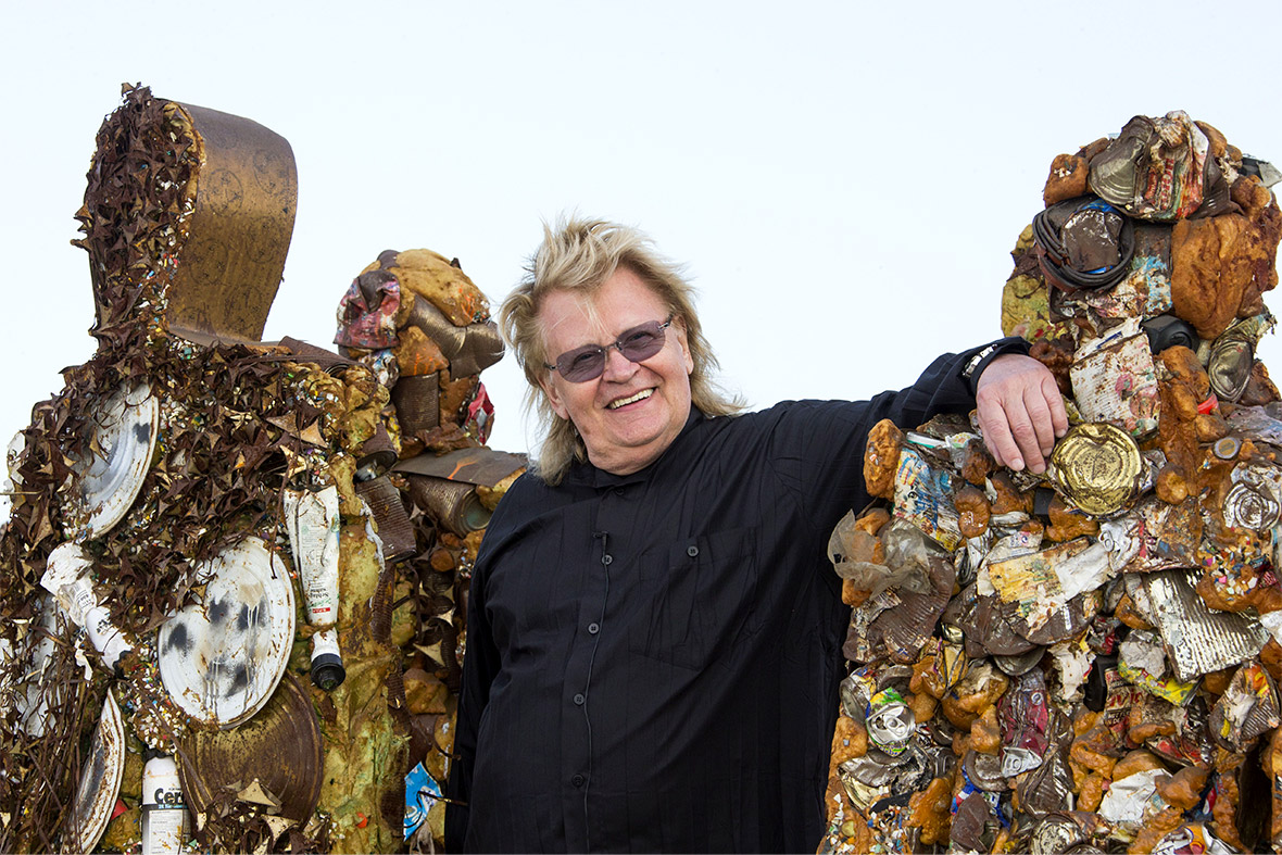 Realizzò opere anche in Italia, come Venezia vive del 1976, nel quale l’artista riempì Piazza San Marco a Venezia di vecchi giornali in un’azione notturna che sorprese il popolo e le autorità veneziane. Ma una delle opere iconiche dell’artista avvenne nel 1996, quando installò un migliaio di Trash People a grandezza naturale su tutti i siti turistici delle più importanti città, come nella Piazza Rossa di Mosca, in Piazza del Popolo a Roma, sulla Grande Muraglia Cinese e davanti alle Piramidi di Giza. I personaggi di spazzatura vennero realizzati con lattine schiacciate, rifiuti elettronici e altri rifiuti come suo commento critico sul consumo umano costante.