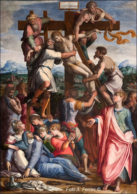 Questo periodo felice però venne bruscamente spezzato con una serie di eventi terribili che scombussolarono la sua esistenza. Prima fra tutte fu la morte del padre, in seguito alla quale entrò in un periodo di miseria, ritrovandosi improvvisamente a carico della madre e dei fratelli minori. Per guadagnarsi da vivere, si cimentò nella realizzazione di pale d’altare, per i conventi e i luoghi di culto, tanto da stabilizzare la sua condizione economica. Qui conobbe l’artista Rosso Fiorentino, la cui espressività tormentata e visionaria delle sue pitture manieriste, influenzerà molto lo stile di Vasari. Possiamo ritrovare queste influenze nella composizione della Deposizione e nel drammatico Cristo portato al sepolcro.