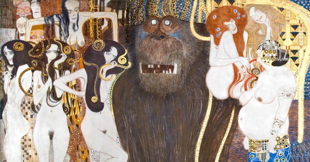 Noncurante delle critiche, negli stessi anni Klimt realizzò anche il Fregio di Beethoven, lungo ben trentaquattro metri, concepito per la quattordicesima mostra secessionista viennese, nei locali del Palazzo della Secessione. Questo trionfo di immagini visionarie, enigmatiche, dionisiache che sottintende le angosce e le aspirazioni dell’uomo moderno, è una delle migliori testimonianze del genio provocatore di Klimt, che da lì a poco verrà travolto dall’uragano artistico da lui stesso causato. Caseina, smalti e intonaco su pannelli lignei incannucciati, frammenti di specchio, bottoni, chiodi di tappezzeria, pezzi di vetro colorato e dorature.