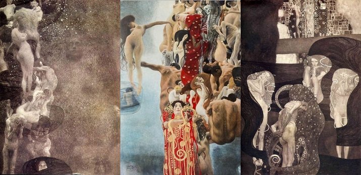 Come prima opera realizzata in seguito alla fondazione del gruppo, Klimt ebbe come commissione la decorazione dell’aula magna dell’Università di Vienna, nel 1894. Forse la sua opera più importante, aveva un tema illuminista legato al trionfo della Luce sulle Tenebre, dal quale si sviluppavano le tre facoltà: Filosofia, Medicina e Giurisprudenza. Quando però i quadri furono completati, vennero rifiutati e aspramente criticati dai committenti, che gli contestarono il contenuto erotico e l’estrema sensualità dei personaggi, non adatti all’Università.