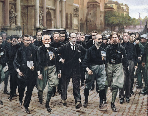 L’idea dell’arte totale proseguì durante tutta la Prima guerra mondiale, fortemente sostenuta dai futuristi, perchè visto come la strada che avrebbe portato l’Italia alla modernità. Anche Balla aderì al fascismo, infatti nel 1926 realizzò una statuetta raffigurante Mussolini, con alla base la scritta “Sono venuto a dare un governo all’Italia” e consegnata direttamente al duce. Divenne così l’artista del fascismo per eccellenza e fu molto apprezzato anche dalla critica. Intorno al 1932 realizza Marcia su Roma, un dipinto realizzato con un chiaro riferimento a Il quarto stato di Pellizza da Volpedo.
