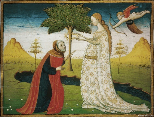 Dopo essere entrato a far parte del seguito del vescovo Giovanni Colonna, Petrarca nutrì una profonda attrazione per la spiritualità cristiana, prendendo anche gli ordini sacri, e divenendo canonico. Fu proprio durante una messa nella Chiesa di S. Chiara di Avignone, che incontrò per la prima volta Laura, la donna che sarà l’amore della sua vita e la sua musa ispiratrice, oggetto della maggior parte delle sue poesie del Canzoniere. La donna incarna l’ideale femminile del suo tempo, al di sopra di ogni pensiero terreno, madonna più che donna, da adorare più che amare, poiché secondo Petrarca attraverso la donna l’uomo avrebbe potuto avvicinarsi a Dio.