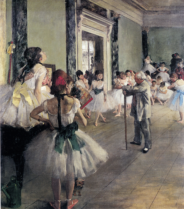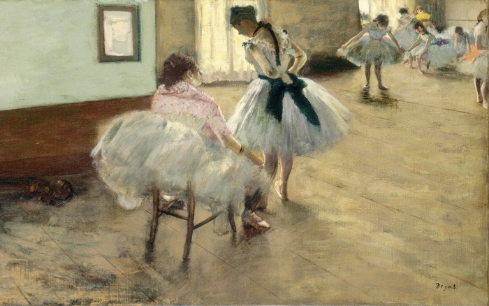 Dipinto nel 1874, La lezione di danza è uno dei quadri più famosi di Edgar Degas, dove ricorre il tema preferito delle ballerine ma anche l’uso sapiente dell’inquadratura fotografica. Realizzato dietro le quinte dell’Opéra di Parigi, scelse di ritrarre il momento in cui le danzatrici stanno provando dei passi di danza prima di salire sul palcoscenico, sotto l’occhio attento del maestro. Le ballerine disposte in semicerchio, si riposano o parlottano distratte, ognuna con un proprio atteggiamento. Ogni loro gesto, apparentemente marginale o secondario, è invece indagato con grande attenzione.