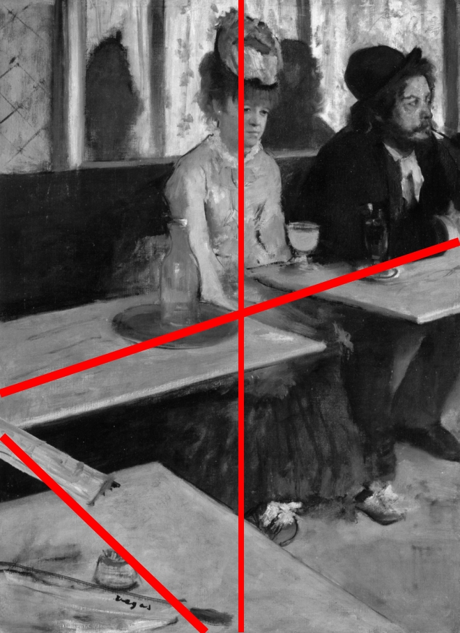 Anche in quest’opera, possiamo notare come i due personaggi non vengano ripresi frontalmente, ma di tre quarti, adottando una prospettiva scomoda. Disponendo i due personaggi in obliquo, sembra quasi che il pittore voglia incastrarli tra il piccolo tavolo ed il divano su cui sono seduti, senza possibilità di fuga. Questa inquadratura fotografica, viene utilizzato come espediente per rispecchiare perfettamente la triste situazione in cui si trovano i due. Angoscia, che viene amplificata anche dalla presenza dello specchio alle loro spalle, sporco e opaco, che mostra a malapena le ombre della prostituta e del vagabondo.