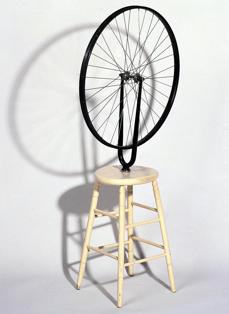 Fu proprio nell’ambiente newyorkese che diede vita al suo primo Ready-made (letteralmente già fatto, già pronto), presentando una comune Ruota di Bicicletta su un piedistallo. Un’operazione che per quanto semplice, fu rivoluzionaria ed epocale che aprì la strada all’arte concettuale. Quest’opera segnò il passaggio da una concezione tradizionale dell’arte concentrata sulla vista e l’estetica, verso una dimensione in cui l’opera d’arte viene percepita attraverso tutti i sensi. Duchamp creò quest’opera perché sentiva la mancanza del camino di casa, e il rumore della ruota in movimento gli ricordava le fiamme.