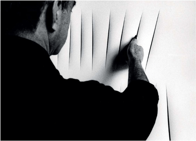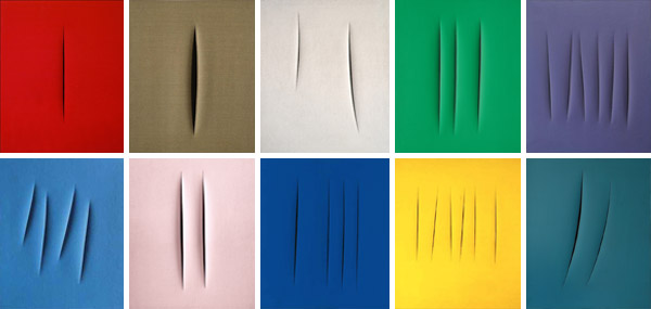 Le sue tele vengono quindi squarciate, attraverso uno o più tagli, netti e regolari, operati con l’intento di oltrepassare la superficie della tela di supporto ricoperta di aniline o di idropittura. I “Tagli” all’inizio si presentano in fitte sequenze, poi tendono a ridursi a pochi unici e netti, dove una garza nera ne chiude sul retro la luce. Un’apertura verso l’altrove, verso nuovi linguaggi, e verso nuove forme e spazi. che tendono ad interrompere la tradizione pittorica bidimensionale della tela, per lavorare sullo spazio che attraverso il taglio diventa tridimensionale annullando la distinzione tra pittura e scultura.
