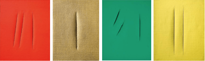 E’ come se Fontana ci dicesse che il mondo vero non è quello che sta sul dipinto o dentro la scultura, ma è quello che si apre oltre lo squarcio. Si può inoltre dire che abbia definitivamente superato la terza dimensione, grazie a un’arte capace di occupare lo spazio. Infatti Fontana cessa quindi di trattare la tela come semplice supporto sul quale applicare del colore, ed inizia a trattarla come materia da modellare proprio come uno scultore modella il suo pezzo di marmo, di gesso o di argilla. E ancora, i tagli sono un modo per superare la finzione dell’arte.