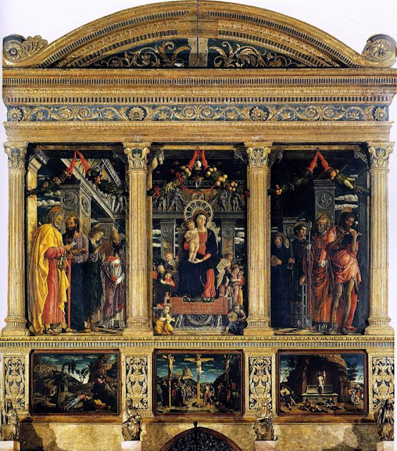 Padova segna profondamente la sua vita professionale, ma Mantegna resterà in questa città fino al 1457, quando decise di trasferirsi a Verona. La scelta di questa città avvenne in seguito al fatto che ricevette una commissione per la realizzazione del Polittico di San Zeno per la chiesa del Santo a Verona, uno dei suoi massimi capolavori. La scena principale della sacra conversazione, è rappresentata all’interno di un quadriportico classico, la cui cornice reale viene illusoriamente continuata dal portico, delimitato da colonne. Il Mantegna fece addirittura aprire una finestra per illuminare la pala da destra, in modo da far coincidere l’illuminazione reale con quella dipinta.