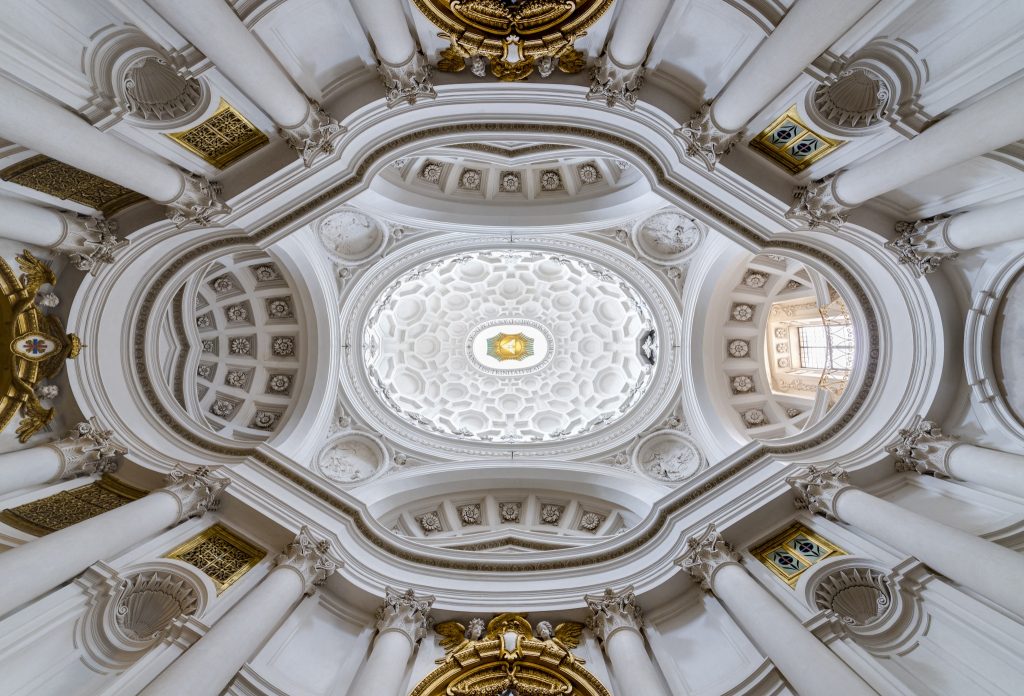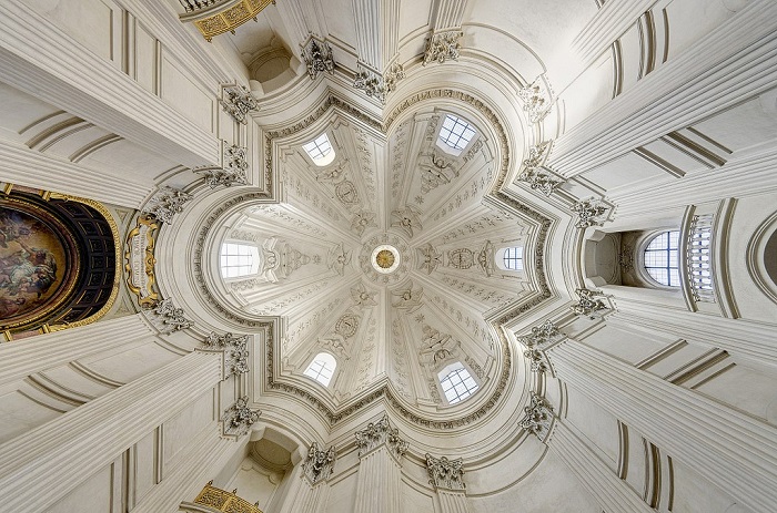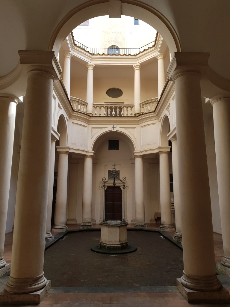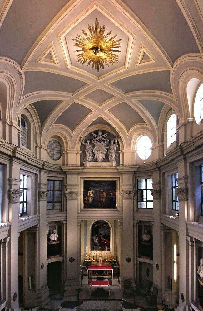 Questo effetto, si nota sia sulla scenografica facciata e sul campanile, ma soprattutto all’interno della chiesa, attraverso una pianta ellittica realizzata interamente da rientranze e sporgenze. L’ambiente interno inoltre è coperto da una splendida cupola ellittica, elegantemente decorata da lacunari in stucco con forme di esagoni, ottagoni e croci, che vanno riducendosi verso l’alto dando l’illusione di una maggiore profondità. Adiacente alla chiesa vi è il chiostro, capolavoro di armonia e proporzione, realizzato su due livelli di pianta ottagonale con gli angoli smussati ad ospitare coppie di colonne, tanto da trasformare la pianta in un ottagono dai lati ricurvi.