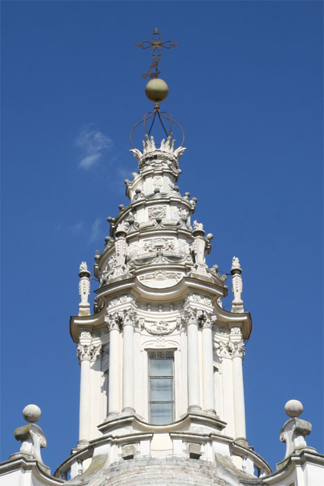 Realizzò un disegno in forma esagonale con cellette disposte a forma d’alveare, di chiaro rinvio all’ape barberina, simbolo papale di Urbano VIII. Questa pianta stellare, mai impiegata prima, è formata da due triangoli equilateri che si intersecano, e tre absidi e tre nicchie che si alternano. La stessa audacia compositiva la si può ritrovare anche all’esterno, sia nel tiburio che copre la maestosa cupola polilobata, sia nella lanterna cuspidata a spirale. Quest’ultima fu decorata con estrema maestria, con fiaccole e corona fiammata su cui sono poste simboli biblici e sapienziali, ovvero una sfera, una croce e una colomba con l’ulivo nel becco, realizzate in ferro battuto.
