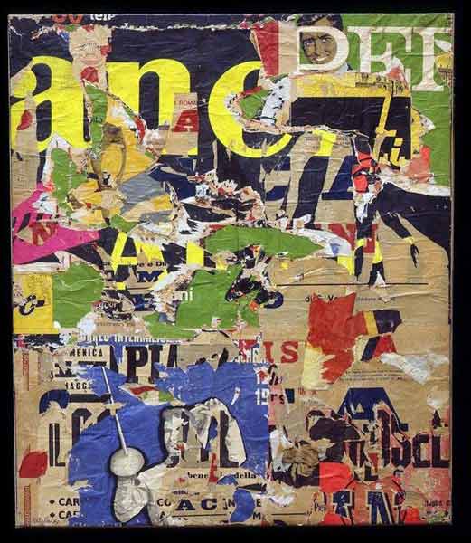 Cercò quindi di fondere il collage dei cubisti con elementi di matrice informale e soprattutto con il ready-made dadaista. Nei primi lavori Rotella utilizza i manifesti pubblicitari scollandoli dal loro supporto di lamiera, assemblandole su tela con pochi interventi di strappi che eseguiti con voluta sapienza, non casuali. Esempi memorabili di questa fase sono Un poco in su e Collage, oppure la serie Cinecittà, dedicata al cinema mondiale con i volti dei grandi miti di Hollywood.