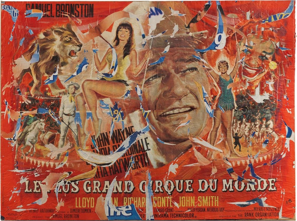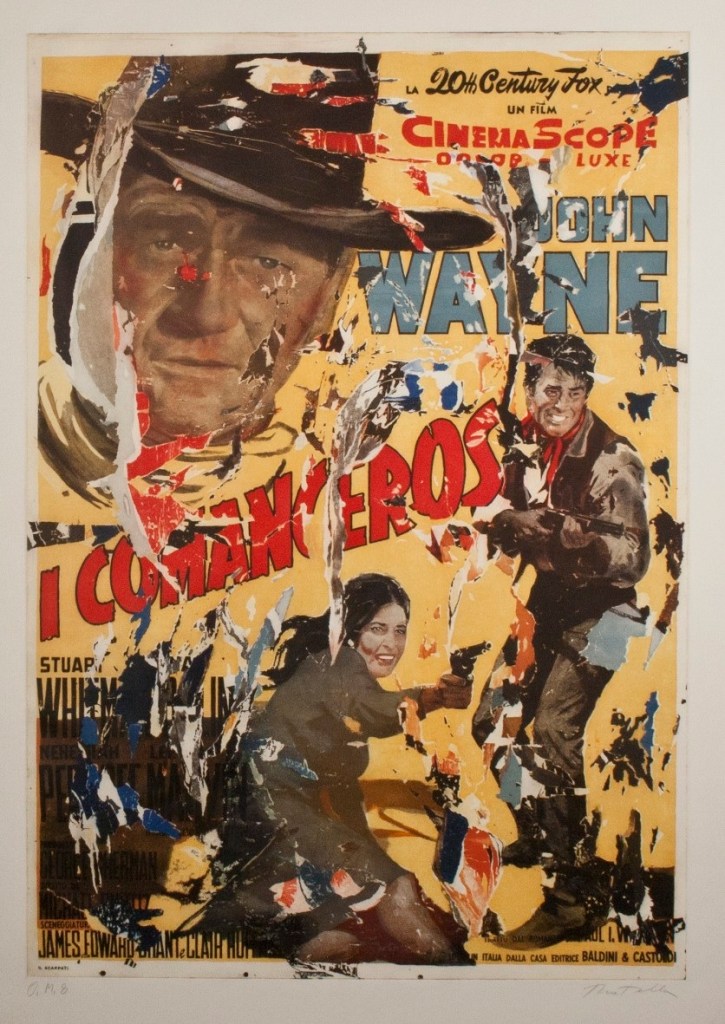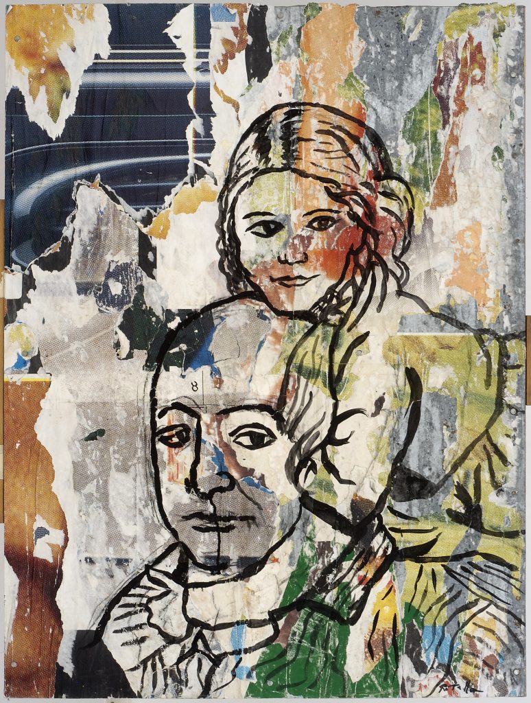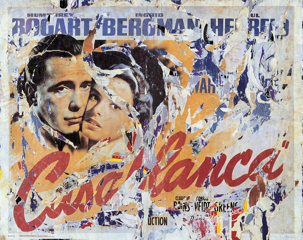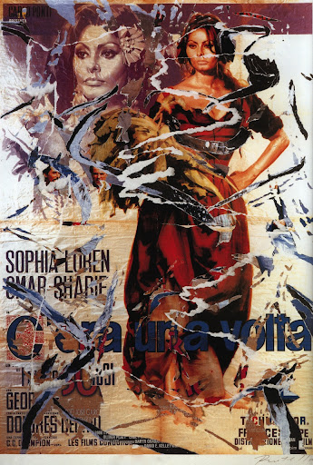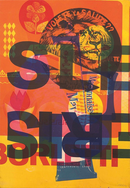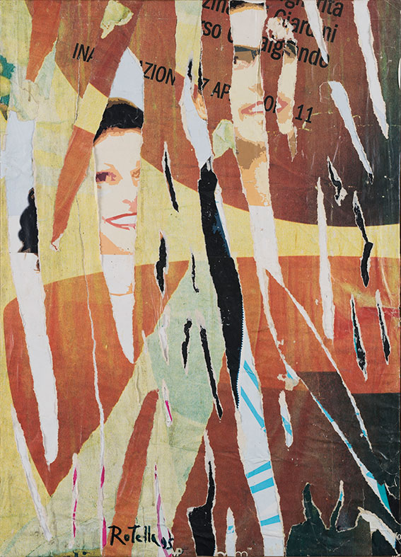 Mimmo Rotella torna in Italia nel 1954 e si stabilisce a Roma dove, ebbe una profonda crisi artistica. Comprese che il mezzo pittorico non era più adatto per l’espressione della sua poetica, tanto che sentì la necessità di utilizzare nuovi strumenti. Fu così che nacque il Dècollage, una nuova tecnica caratterizzata dallo strappo di manifesti pubblicitari affissi nelle strade, i cui frammenti vennero incollati sulla tela, per dare vita ad opere originali. E’ praticamente l’opposto del collage che avviene con una sovrapposizione di immagini, a differenza del décollage che opera attraverso una sottrazione dell’immagine mediante strappi ed abrasioni.