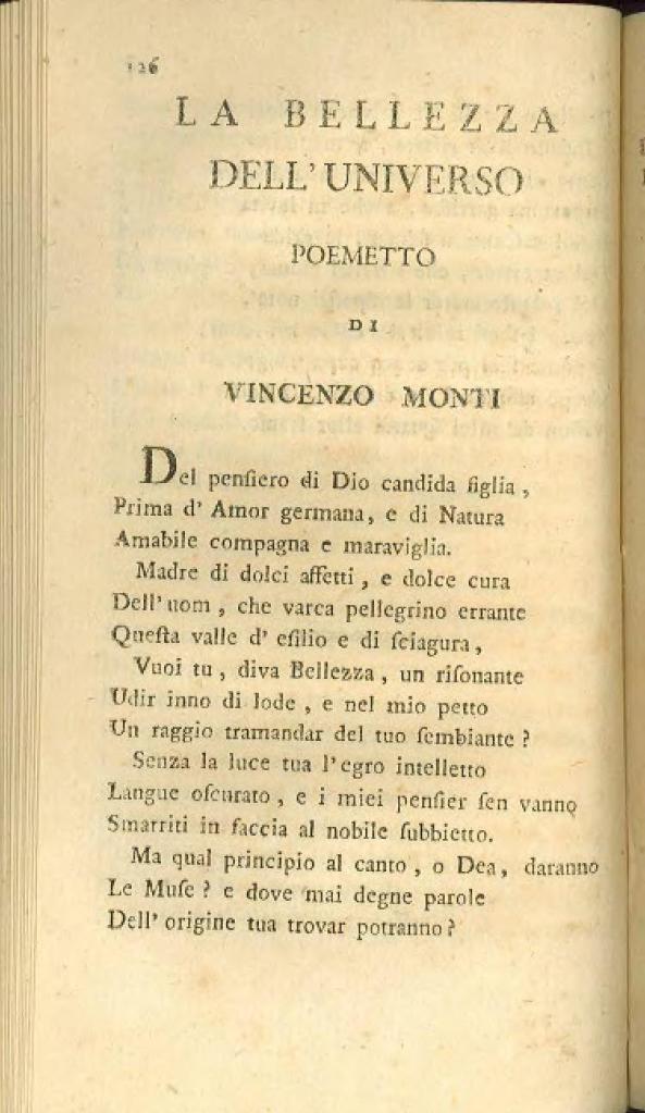 Colpito da una crisi esistenziale tra il 1793 e il 1797, Vincenzo Monti decise improvvisamente di avvicinarsi agli ideali repubblicani e giacobini, al punto di decidere di abbandonare definitivamente Roma, città ormai sempre più preda dei fermenti anticlericali. Si trasferì quindi a Milano, divenendo sostenitore del potere napoleonico, ottenendo vari incarichi nella Repubblica cisalpina e la cattedra di eloquenza all’università di Pavia. A questo periodo vede progressivamente spegnersi la sua vena poetica celebrativa, caratterizzata solo dall’opera Musogonia, che narra la nascita delle muse, e che viene dedicata a Napoleone. Notevoli, invece, furono i risultati con le opere di traduzione della Pucelle d’Orléans di Voltaire, e dell’Iliade, traduzione che lo rese famoso a livello europeo.