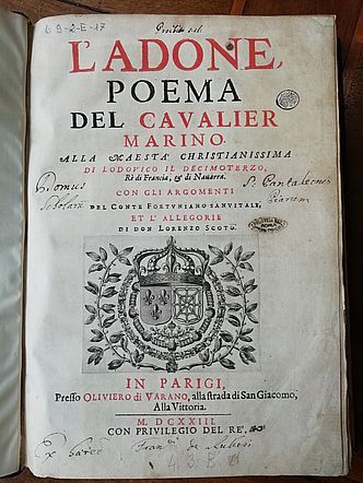 Nel 1615 Maria de’ Medici, moglie del defunto Enrico IV di Francia, lo chiama alla corte di Parigi. Fu questo il momento in cui la carriera di Marino raggiunse il massimo prestigio letterario e sociale, dove scrive quello che può essere considerato il suo capolavoro, l’Adone. Quest’opera racconta la favola della relazione amorosa tra Venere e Adone, dedicato al re Luigi XIII di Francia e a sua madre, Maria de’ Medici. Costituito da 20 canti e un proemio iniziale, questo lavoro verrà ritenuto uno dei più importanti poemi della storia della letteratura italiana.