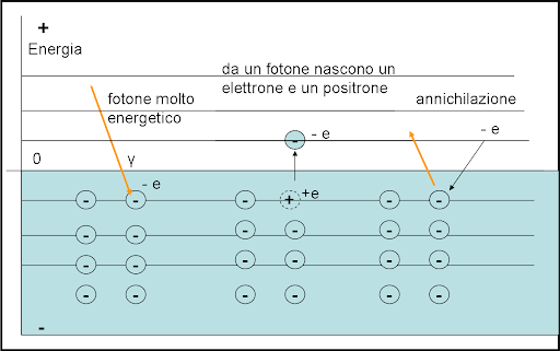 In realtà, l’Equazione di Dirac, descrive il moto delle particelle a spin semintero, come elettroni e protoni, le cui soluzioni, sono tali che saltino fuori energie negative. Dirac spiegò questi risultati introducendo il famoso concetto di “mare di Dirac“, ovvero ipotizzando che gli elettroni, si muovessero formando delle vere e proprie lacune, che avrebbero dunque avuto energia negativa. Fu così che Dirac predisse l’esistenza di una particella gemella dell’elettrone, che prese il nome di positrone, con la stessa massa dell’elettrone ma con carica opposta.