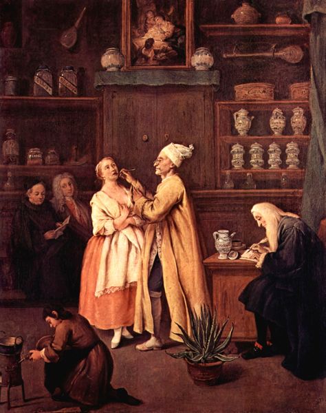 Questo aspetto incuriosì moltissimo Longhi, che accanto ad opere sulla vita aristocratica, iniziò a ritrarre anche scene di vita borghese e popolana con altrettanta vivacità, malizia e leggera ironia. Ad esempio nelle sue tele si concentrò prevalentemente nel riprodurre le carriere più comuni, come Il cavadenti, L’indovino, La venditrice di frìtole o il noto Il farmacista, dove Longhi unì l’influsso francese con un’osservazione bonariamente ironica di stampo e di colore veneziano.