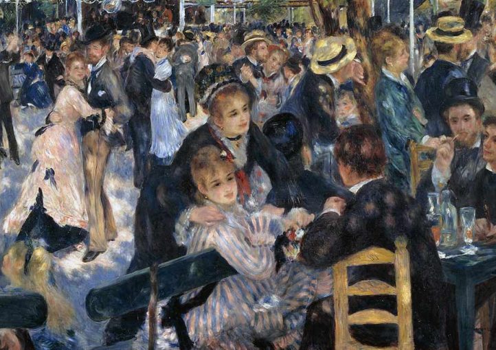 E’ dunque Renoir, insieme agli amici, a dare il via alla rivoluzione del gusto. I suoi dipinti furono caratterizzati da scintillanti effetti di colore e dalla luminosità della pelle di giovani donne all’aperto. Fu proprio l’energia di questi corpi giovani e dalle forme generose, ad essere uno dei segni distintivi delle sue opere, in cui la fisicità del corpo diventa un inno alla gioia di vivere e alla spensieratezza. Di questa idea sono le opere: La colazione dei canottieri, Le Moulin de la Galette, Madame Georges Charpentier, Esmeralda che danza.