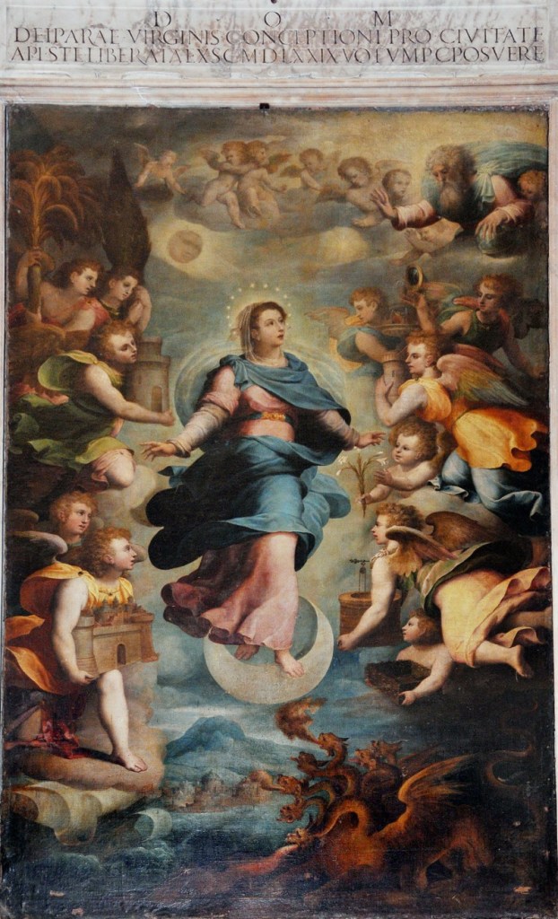 Nella seconda metà del Cinquecento, la peste che colpì gran parte dell’Italia, portò i fedeli a rivolgersi all’Immacolata per la fine della pestilenza. La Vergine venne quindi connotata con i simboli dell’Apocalisse, ovvero la falce di luna e la corona di stelle, e rappresentata nell’atto di avanzare, circondata ai lati dagli angioletti con in mano i simboli lauterani. Il panorama dell’iconografia mariana nel ‘600 e ‘700 è vastissimo. Il trionfo della Madonna viene sancito su ogni versante, ovvero nella liturgia, nella devozione, nella politica e nelle arti.