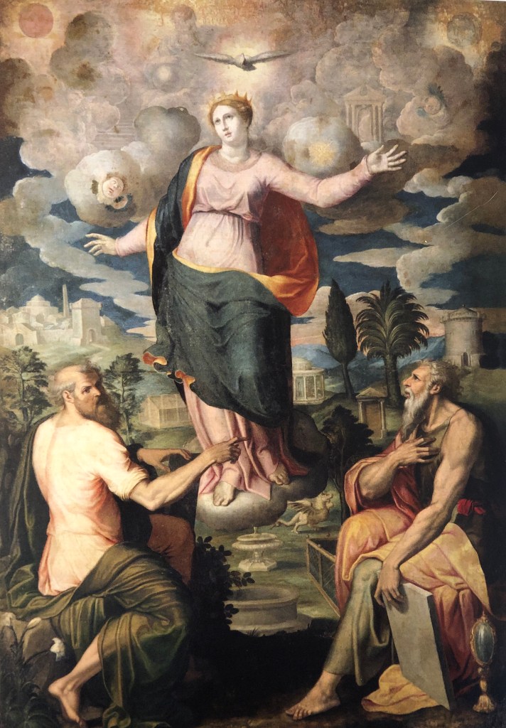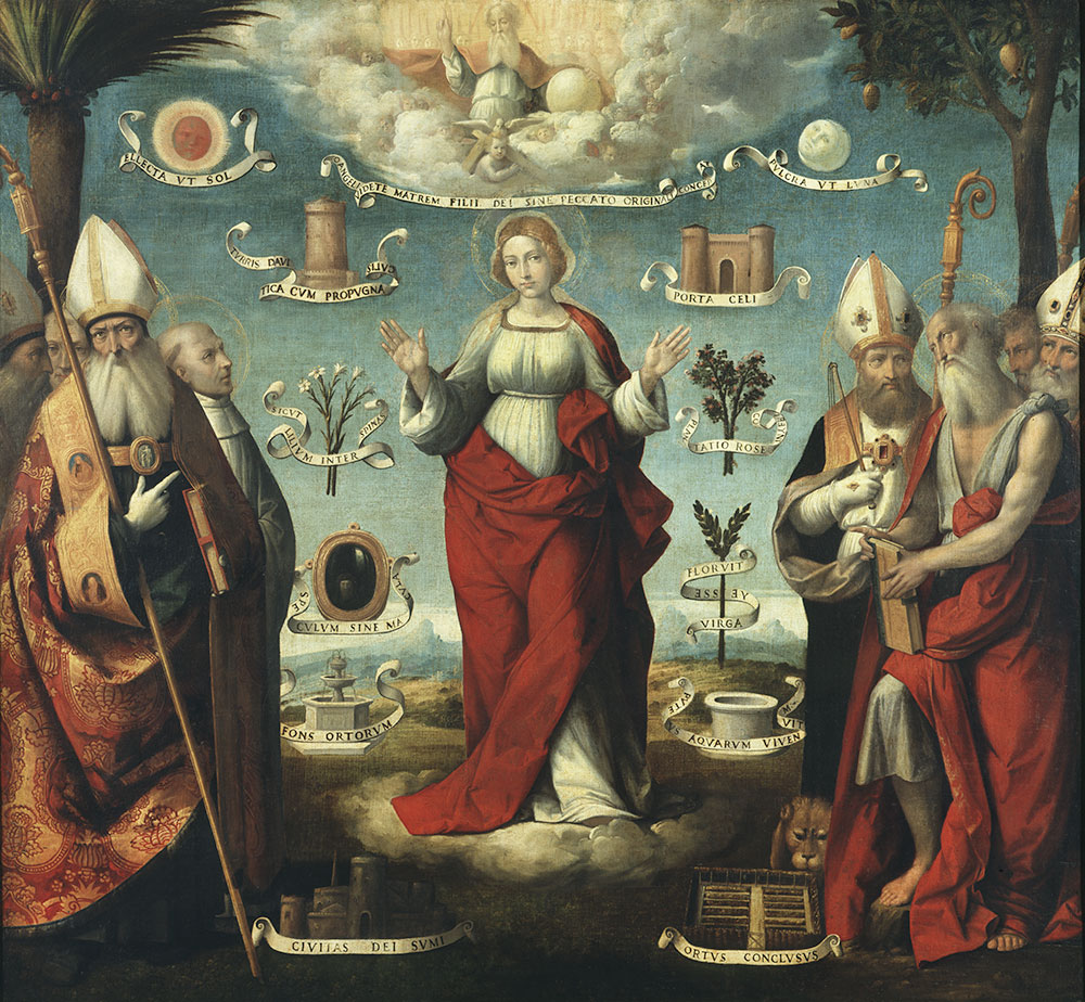 Con il passare del tempo, prevalse un complicato schema simbolico, derivante da alcune fonti letterarie, come la Bibbia, la letteratura medievale e la ricca raccolta della Litanie lauretane. Ad esempio, l’artista tardorinascimentale Benvenuto Tisi da Garafolo, concepì un’Immacolata circondata da numerosi simboli, aventi ognuno un’iscrizione latina sottostante, come se fosse quasi una didascalia esplicativa.