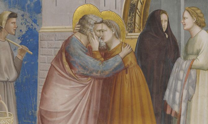 Le sue prime raffigurazioni risalgono al periodo gotico, attraverso una riproduzione di tipo emblematica con un’interpretazione lasciata a chi l’osserva. Infatti in un primo momento, il concepimento di Maria è raffigurato soltanto attraverso il casto bacio tra Anna e Gioacchino alla Porta d’Oro. Oppure in alternativa, la Vergine è raffigurata come l’ultimo germoglio dell’albero genealogico della stirpe di Davide, inserito nella storia di Israele e perciò appartenente alla vicenda umana.