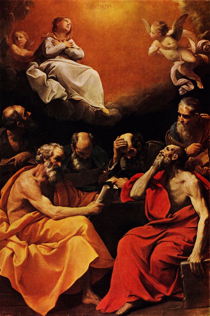 Sempre nel tema vi sono anche le prime opere che raffigurano le dispute del dogma, e chiamate per questo ‘storico-dogmatiche’. Le controversie dottrinali sono raffigurate, ad esempio, in quest’opera seicentesca di Guido Reni in cui la Vergine, assisa su una nuvola al cospetto di Dio, è posizionata sopra i quattro santi disposti a semicerchio che cercano di approfondire l’argomento. Tutto rappresentato con estremo realismo, a partire dalla resa delle carni dei due santi in primo piano.