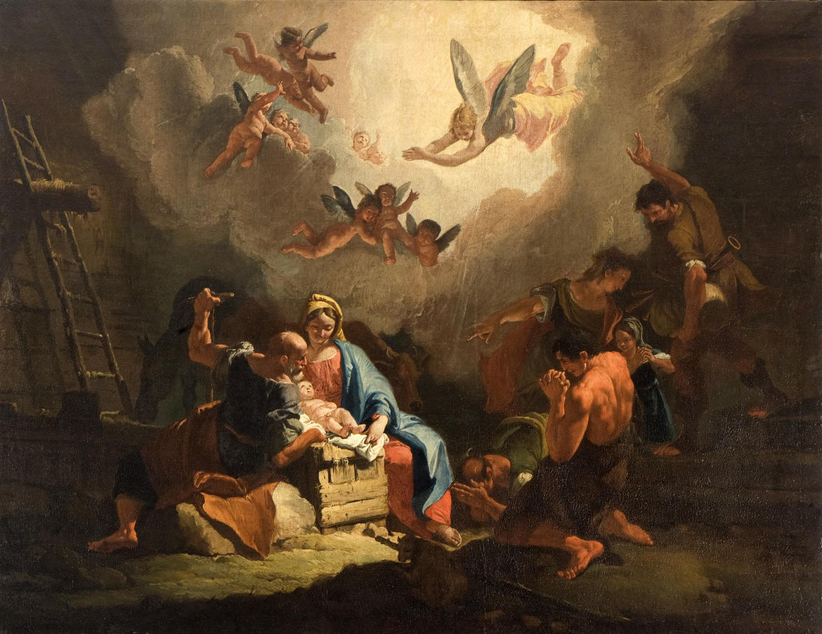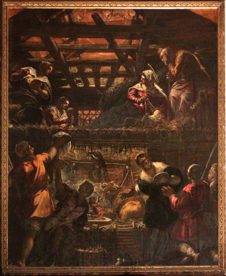 Di particolare e straordinaria fattura è l’opera di Jacopo Tintoretto, artista soprannominato “Il furioso”, per l’uso violento dei colori e le sue iperboliche prospettive. Dettagli che colpiscono lo spettatore, dando l’impressione di precipitare nel dipinto. Anche in quest’opera, realizzata per le sale della Scuola Grande di San Rocco a Venezia, la prima cosa che colpisce è la profondità della scena, che si sviluppa su due diversi piani, quella dei pastori al piano terra e quella della Sacra Famiglia in alto. Molto importante è anche l’uso del contrasto tra ombre e luce.