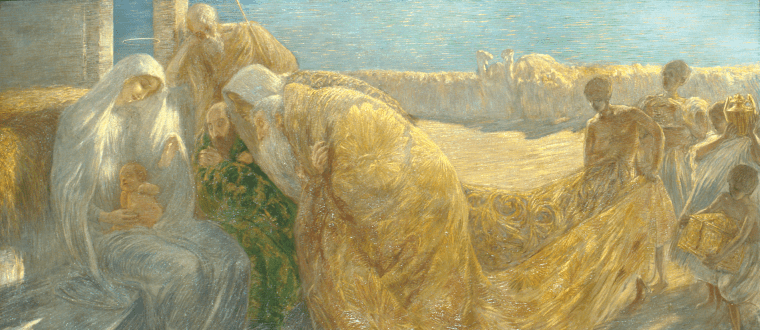 Per ultimo nella lista di artisti che raffigurano l’evento della Natività, troviamo a distanza di anni dai precedenti, il pittore ferrarese Gaetano Previati. Appartenente al filone dell’arte divisionista, amava dividere il colore in singoli punti e linee, che interagendo tra loro, donavano un senso di continuità visiva. Inoltre questa resa visiva spettacolare, era aumentata dai colori abbaglianti e chiari che venivano posti in contrasto. Anche nel caso della Natività, non farà eccezioni.