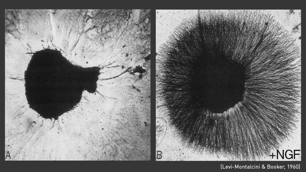 Fu nel 1951-52, che durante la sperimentazione di un trapianto di tumore di topo sul sistema nervoso dell’embrione di un pulcino, Rita scoprì il fattore di crescita nervoso, ovvero una proteina essenziale nella crescita e differenziazione delle cellule nervose sensoriali e simpatiche. Prendendo il nome di NGF, ovvero Nerve Growth Factor, tale studio aprì la strada ad un filone di ricerca che sarà legato indissolubilmente al nome di Rita Levi Montalcini.
