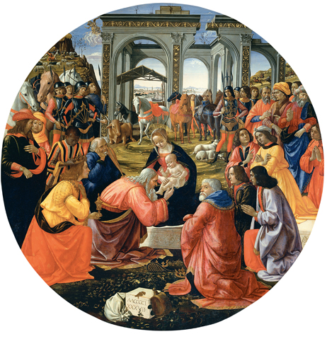 Su questo tema si cimentò anche il pittore fiorentino Domenico Ghirlandaio, che ci lasciò due bellissime versioni dell’Adorazione dei Magi. La prima fu quella Tornabuoni, realizzata nel 1487 per la cappella della famiglia omonima, e la seconda quella degli Innocenti, commissionata un anno più tardi dal priore dello Spedale degli Innocenti di Firenze. La prima appare chiaramente ispirata a Botticelli, con l’aggiunta di riferimenti alla pittura fiamminga, come la rappresentazione dell’elemento naturale e la minuziosità dei dettagli.