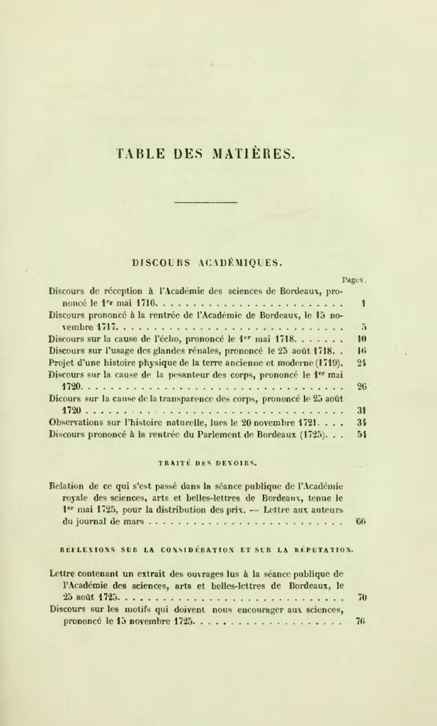 Ottenuta questa fama, venne inoltre nominato membro della prestigiosa Accademia delle Scienze di Bordeaux e, nel 1727, di quella di Francia. Qui presentò e discusse interessanti memorie di anatomia, botanica, fisica, e più in generale argomenti scientifici e filosofici, tra cui Les causes de l’écho, Les glandes rénales et La cause de la pesanteur des corps. Con un atteggiamento critico di stampo illuminista considerò la religione e la Chiesa come “instrumentum regni”, condannando ogni forma di acquiescenza dell’uomo sia verso essa sia verso lo Stato.