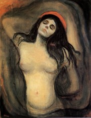 Nella prima opera intitolata il Bacio, infatti, viene rappresentato un momento passionale di un uomo e una donna, che si fondono diventando un tutt’uno. Questa fusione è interpretata in modo ambivalente, sia come forte sentimento che unisce, sia come coinvolgimento amoroso che spersonalizza l’uomo, perdendo la sua individualità. L’idea di Femme Fatale, si assapora anche nell’opera Madonna, dove viene rappresentata una donna sinuosa e nuda con capelli scuri, che in modo provocatoria simboleggia la Vergine Maria, simbolo dell’amore puro.