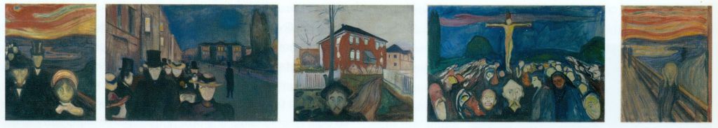 l’impressione di travolgerlo. Lo sguardo vuoto e cadaverico della massa, vuole fungere da spaventosa e angosciosa minaccia. Altra opera della serie, la più conosciuta ed acclamata, è intitolata l’Urlo, che rappresenta l’angoscia esistenziale provata dall’artista stesso. L’uomo dell’urlo sembra uno spirito dagli occhi spalancati, che vittima del suo stesso sentimento, rappresenta il dramma collettivo delle sensazioni di angoscia, paura e dolore.