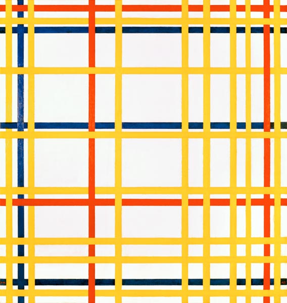 In Composizione con 4 linee Gialle, c’è un’innovazione sorprendente in quanto appaiono linee colorate spesse, invece di linee nere, pratica che rimarrà dominante nel suo lavoro sino al suo arrivo a Manhattan. Lasciò infatti Parigi nel 1938, a causa dell’avanzamento del fascismo, trasferendosi prima in Gran Bretagna, precisamente a Londra, e poi due anni dopo, a New York dove rimase fino alla morte. Le opere di questo suo ultimo periodo, come Composizione e Place de la Concorde, mostrano molte più linee colorate che in qualsiasi altro lavoro, sistemate in una maniera sovrapposta, quasi cartografica.