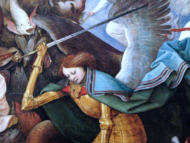 L’opera descrive in dettaglio il primo confronto tra Bene e Male, anche prima della caduta dell’uomo, quando l’angelo più potente, Lucifero si rivolge all’autorità divina. Successivamente, viene inseguito in cielo dall’Arcangelo Michele su ordine di Dio, provocando la caduta degli altri angeli ribelli. Ecco infatti che al centro della scena riconosciamo l’Arcangelo, con armatura dorata, ali spalancate e spada sguainata, che allontana dal Paradiso gli angeli che hanno osato ribellarsi a Dio. Ad aiutarlo nella lotta, creature angeliche trionfatrici e una luce divina che appare in cielo.