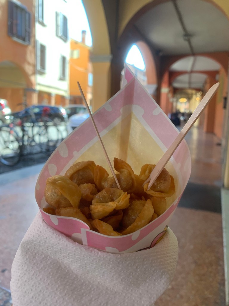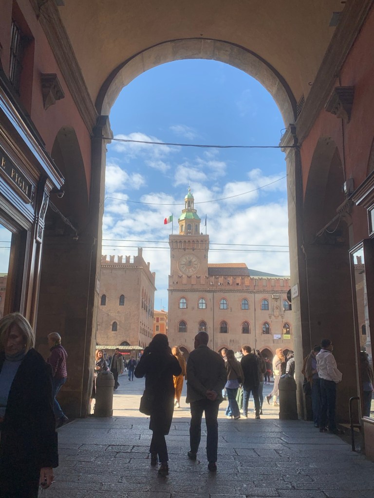 Dopo aver visitato l’interno della Basilica, dalla piazza mi sono diretta verso Via delle Pescherie Vecchie, vicoletto caratteristico dove un tempo si concentravano tutte le botteghe antiche per la vendita di carne e pesce. Oggi quei locali sono stati trasformati in piccoli ristorantini e bistrot per fare aperitivi e pranzi dove gustare le prelibatezze bolognesi, come mortadella e tortellini.