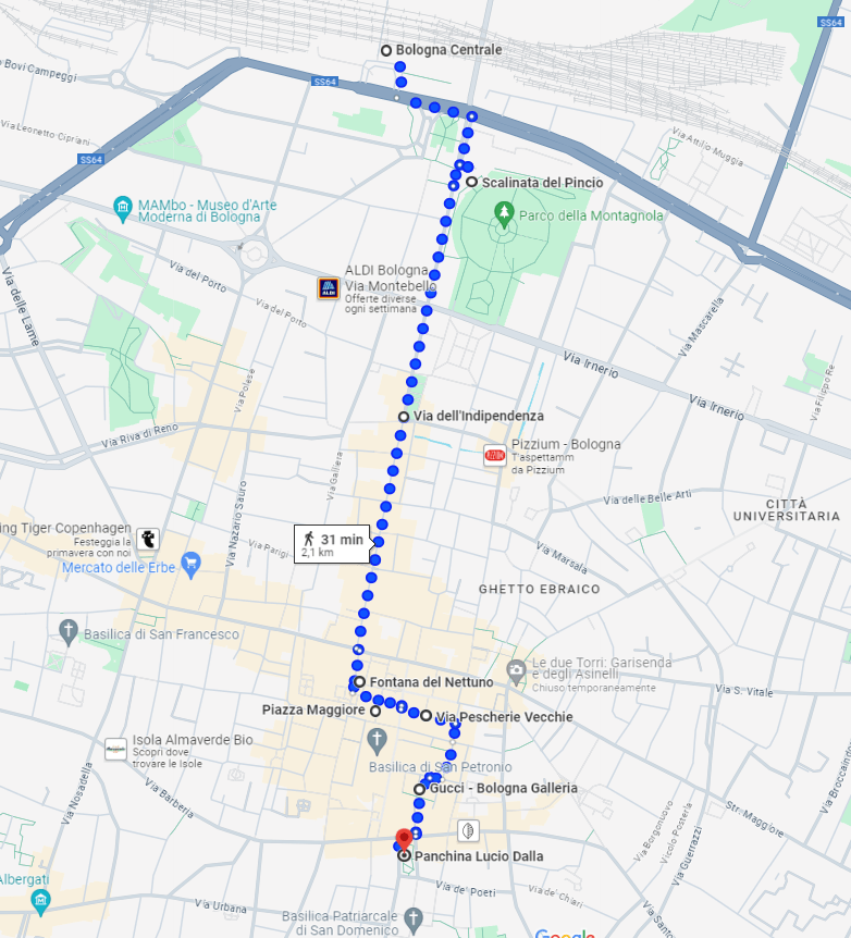 Scesa dalla Stazione Centrale, mi sono diretta verso il centro storico, passando inizialmente davanti al Parco della Montagnola, il giardino più antico della città, nel quale fare passeggiate sotto gli alberi, riposare sulle panchine o assistere a numerose manifestazioni, giochi e gare sportive.